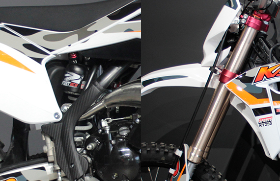 2021款KT250針對國內(nèi)日常林道穿越及林道比賽設計,車架采用K6R同款特種材質(zhì),重量輕、強度大;搭載最新款兩沖程發(fā)動機,動力更加充沛,質(zhì)量更加可靠;匹配尼比38口徑化油器,相對于同級別產(chǎn)品相比,動力輸出更加暴躁;標配CNC360度防摔離合把、剎車把、7系競技鋁圈、競技剎車、DID鏈條等專業(yè)競技車配置,滿足日常林道穿越及林道比賽使用。